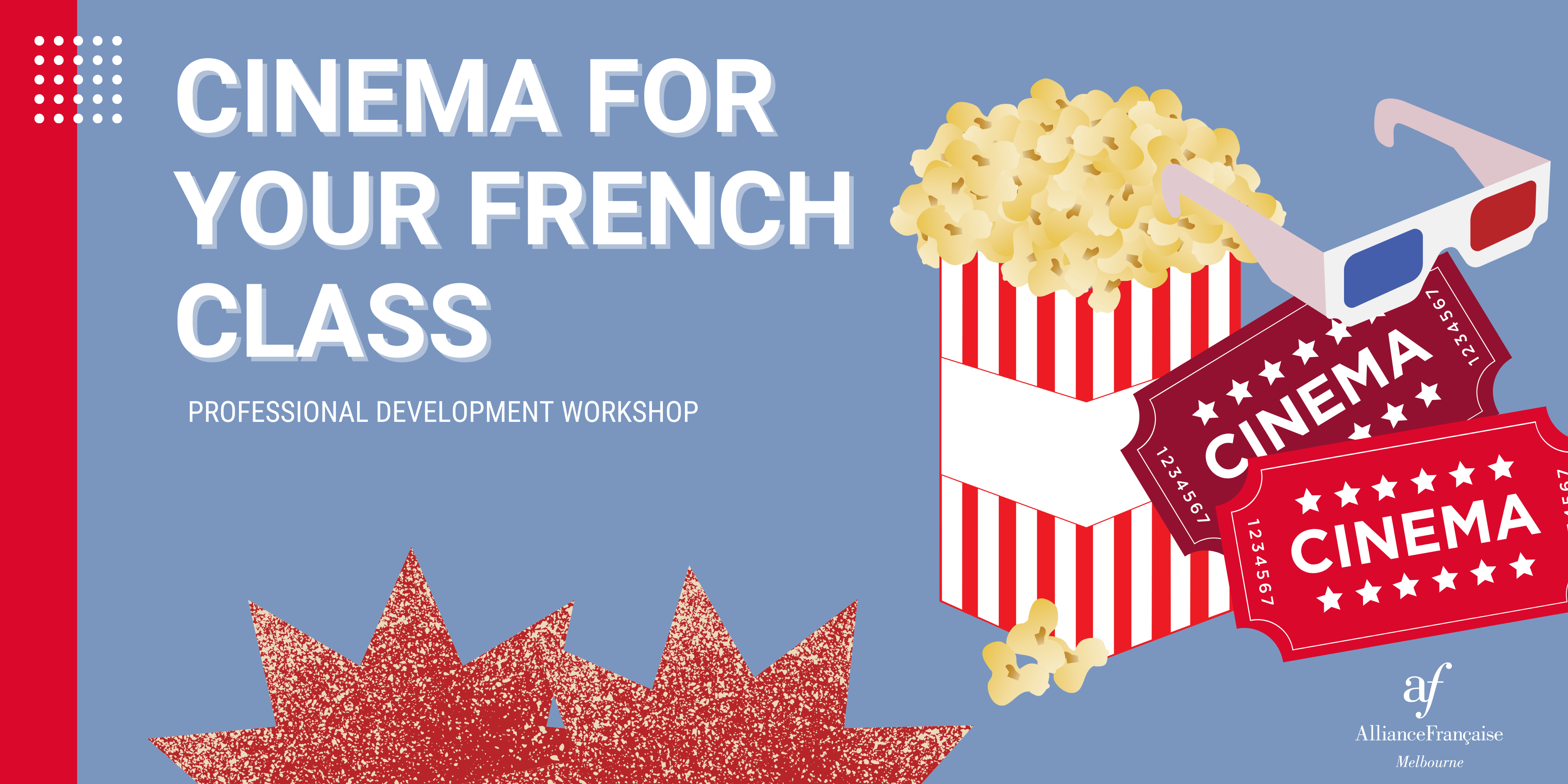 This professional development workshop provides an opportunity for school teachers of French to discuss strategies, resources and activities to engage students through French cinema. During this workshop, we will cover a selection of artists, films and themes from today's French cinema scene. All material covered will be suitable for secondary school students. You will have an opportunity to exchange ideas and experiences with other teachers. By the end of the workshop, you will be equipped with new ideas and resources, including a ready-to-use lesson plan on the theme of French cinema.
